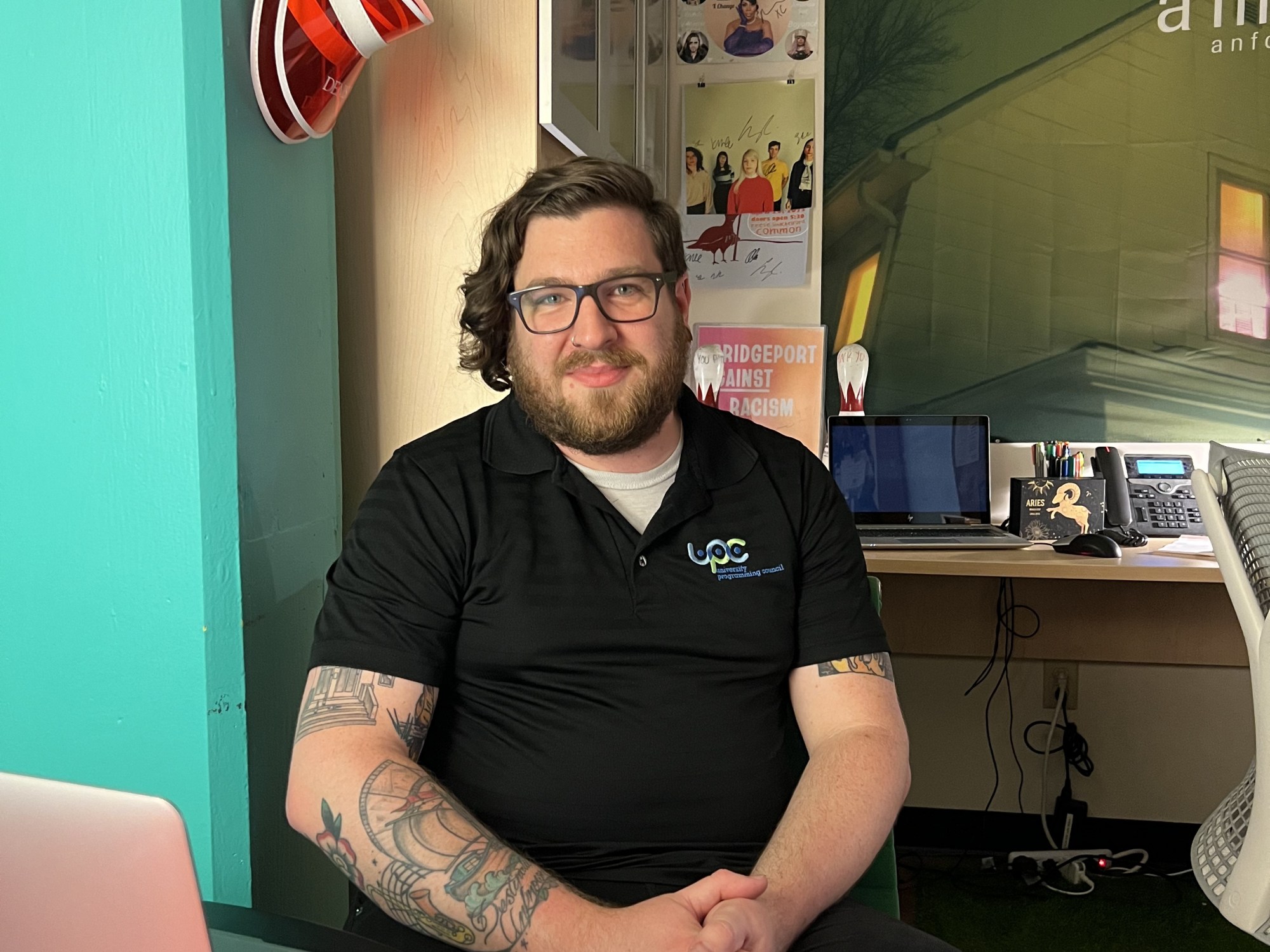Fina, 33, is in charge of working with campus organizations, facilitating traditions, organizing events, managing the Slayter Student Union building, working on the tech side of the WhatToDU and EMS (Event Management Software), supervising faculty and student staff members, and overseeing the Bandersnatch. He’s often wearing many hats at once, but he likes it that way.